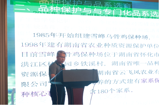 曲湘勇教授从雪峰乌骨鸡品种的形成历史、外形特征和营养特征三方面对种质资源进行介绍。接着,他强调品种保护与专业化品系培育的重大意义,提议要将怀化市的资源优势转化成经济优势,进行商业化的品种创新,加大创新成果的开发与利用。