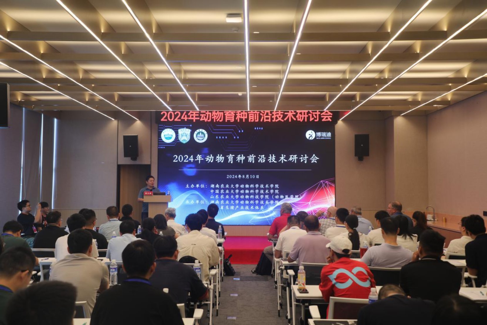 8月10日,由zoty中欧体育、中国农业大学zoty中欧体育、山东农业大学动物科技学院(动物医学院)联合主办,湖南省畜禽遗传资源委员会、湖南省生猪产业技术体系协办的“2024动物育种前沿技术研讨会”在长沙成功举办。来自湖南省种猪遗传评估中心、省瘦肉型猪核心育种场和种公猪站、美国威斯康星大学、爱荷华州立大学、中国农业大学、山东农业大学、中国农业科学院、PIC种猪改良国际集团(中国)等30余家科研院校、种猪企业约120位专家学者、专业技术人员和研究生齐聚长沙,深入探讨动物育种领域的前沿技术,携手探索畜禽遗传改良与新品种培育的创新方向与发展路径。