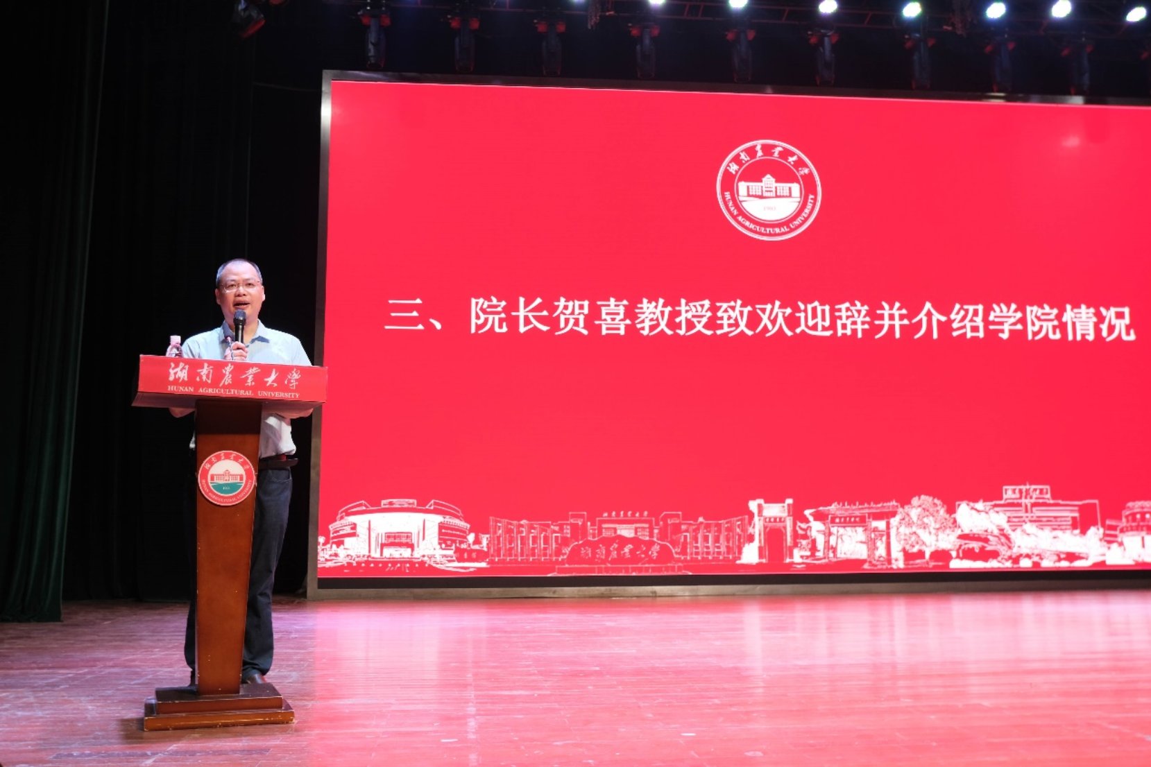 院长贺喜教授致欢迎辞并介绍学院情况,他代表学院对2024级本科生的到来表示热烈欢迎,并从历史沿革、学科特色、教学成果、发展状况、科研建设、人才培养、学生发展与就业等方面介绍学院的基本情况。他强调,要学会学习,以优秀学生为榜样,改变学习方法,转变学习观念,永葆无穷“好奇心”,实现从“要我学”到“我要学”的飞跃;要学会生活,养成健康生活习惯,保持积极向上心态,充分借助学生组织、协会、社团等平台,体验丰富多彩的大学生活;要学会沟通,敞开心扉、广泛交友、互学互鉴,拓展交流合作的“朋友圈”,学习借鉴“学霸宿舍”经验,促进个人全面发展。他寄语新生“只要热爱,山海皆可平,处处皆风景”,强调大学不是奋斗的终点,而是一个新的起点,要充分发挥主观能动性,适应环境、顺应形势、与时俱进,享受知识、形成智慧、展示自己,让大学生活成为生命中一段美好而充实的回忆。