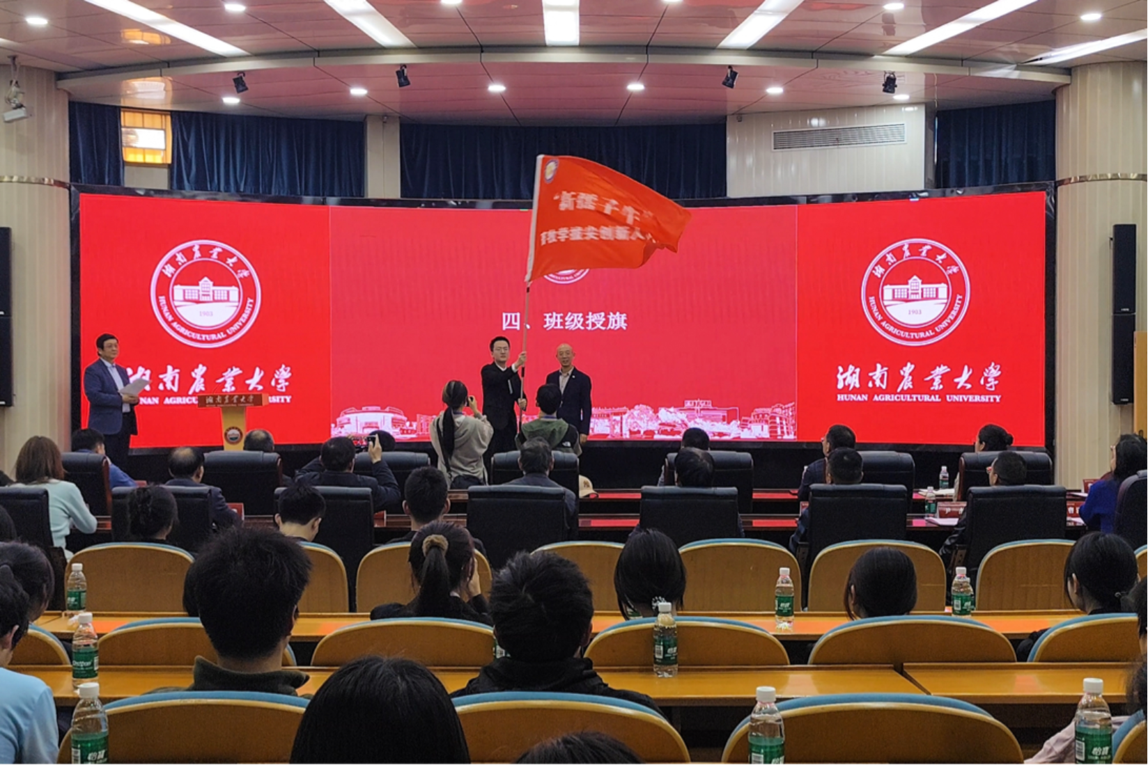 仪式上,校党委委员、副校长杨国顺为第一届“新孺子牛班”授予班旗。