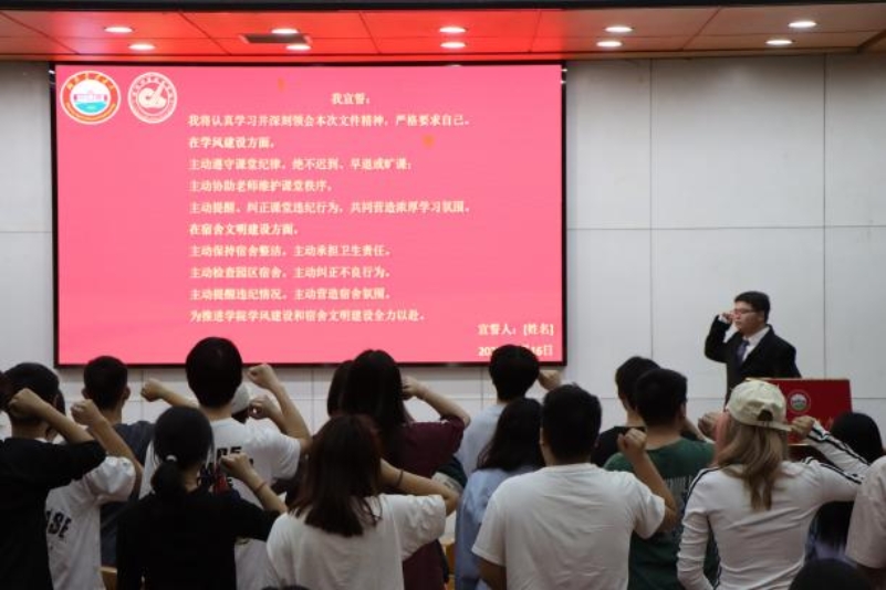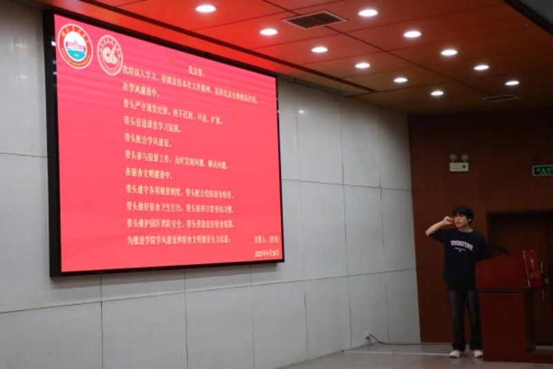 随后,学院学生自律委员会代表王昶杰同学和党员代表刘磊同学分别上台宣誓。学院学生自律委员会代表们和党员代表们承诺,将发挥模范带头作用,积极参与学风建设和宿舍文明建设工作,监督和引导同学们遵守各项规章制度,共同营造良好的学习和生活环境。