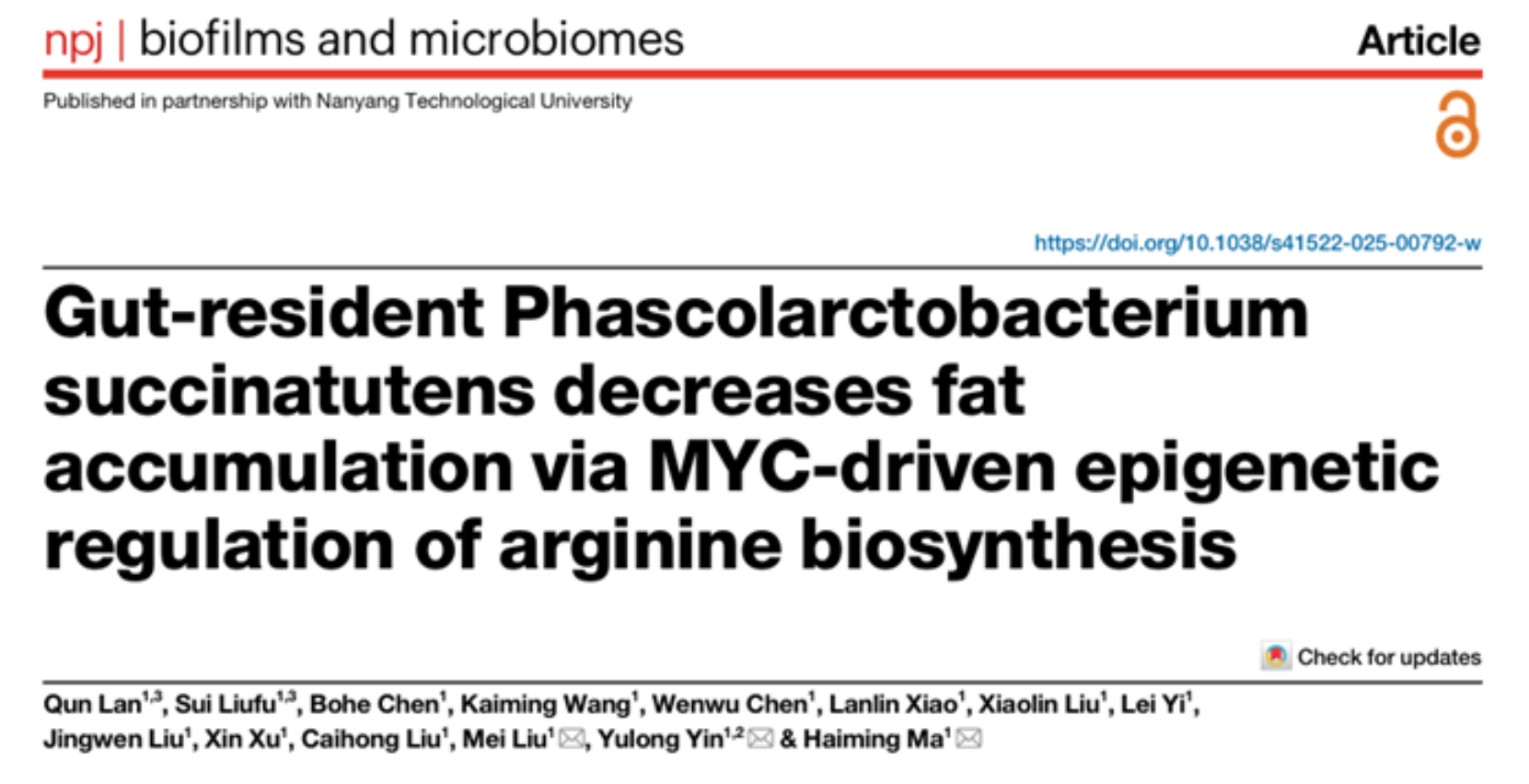 近日,Zoty体育农业农村部畜禽资源(猪)评价利用重点实验室/岳麓山实验室畜禽品种创制中心印遇龙院士团队在Nature旗下期刊《npj Biofilms and Microbiomes》(IF5y: 9.9,中科院一区Top)上发表了题为 “Gut-resident Phascolarctobacterium succinatutens decreases fat accumulation via MYC-driven epigenetic regulation of arginine biosynthesis” 的研究论文。岳麓山实验室畜禽品种创制中心印遇龙院士以及猪遗传育种与繁殖研究团队马海明教授和刘梅教授为论文共同通讯作者。zoty中欧体育2022级博士研究生蓝群和刘付穗为共同第一作者。