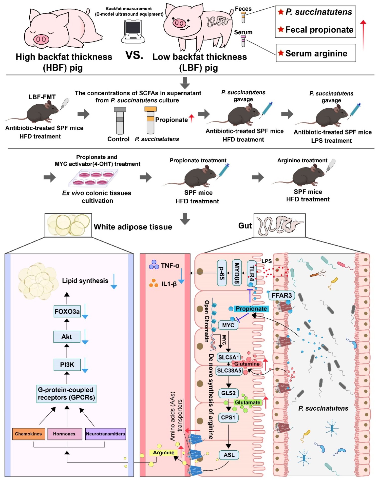 该研究针对畜牧业中过度脂肪沉积问题,通过对129头商品约克夏猪的菌群全关联分析,结合宏基因组测序和非靶向代谢组学技术,发现低背膘厚个体肠道内P. succinatutens丰度显著升高并与血清精氨酸水平正相关。利用粪菌移植与单菌定植小鼠模型,并整合转录组学和表观遗传组学(ATAC-seq)分析,证实该菌通过代谢产物丙酸盐抑制TLR4信号通路减轻肠道炎症,并通过降低MYC染色质可及性下调MYC表达,解除其对谷氨酰胺转运体(SLC1A5和SLC38A5)的抑制,促进精氨酸的生物合成,由P. succinatutens诱导升高的精氨酸通过抑制PI3K/Akt/FOXO3a信号通路,进而减少脂肪沉积。