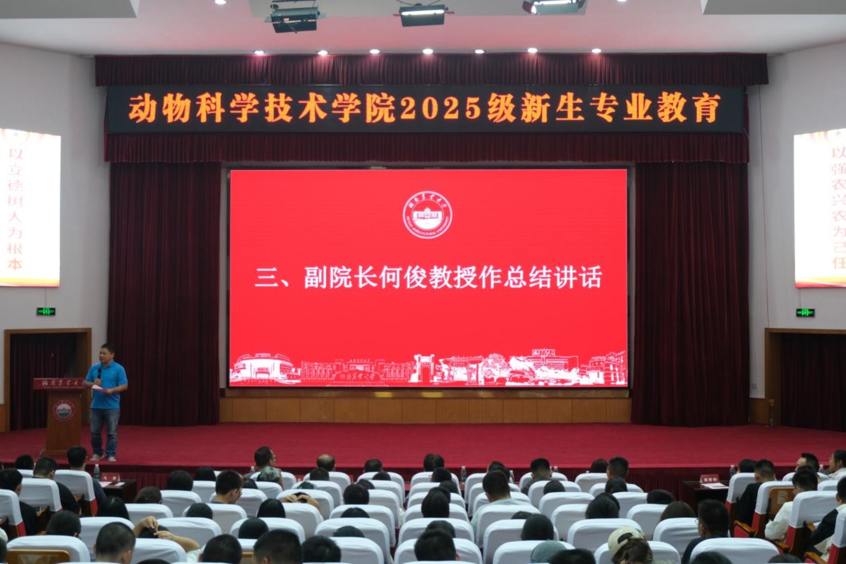 侯德兴教授以“付诸行动,开拓未来——一个动科校友的实话实说”为题,结合自身从农大求学至海外科研的成长经历,为新生带来一场生动而深刻的专业教育课。他展示了自己1978年入学时的学生证、毕业证和宿舍老照片,回顾了在Zoty体育畜牧兽医系的求学时光。他鼓励同学们在大学期间要打好基础、找准兴趣、勇于尝试,并强调“真正的兴趣是持续行动的动力”。随后,侯德兴教授指出,大学阶段应重点培养三种能力:一是沟通交流能力,面对面的交流仍是AI无法替代的;二是独立思考能力,要对信息源头保持警惕,不盲从AI结论;三是执行能力,“想好了就要动起来,不能只想不做”。他还建议新生在专注专业学习之余,广泛涉猎“杂学”,全面提升综合素养。最后寄语同学们要相信自己、付诸行动、勇于挑战、充实人生。