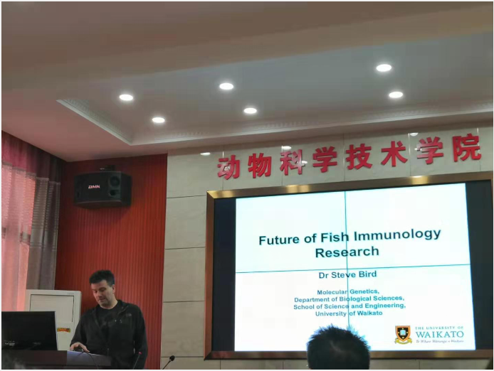 2019年12月7日,动物科技学院在二教501邀请了新西兰瓦凯拓大学博士生导师、国际著名水产免疫学一区期刊Fish and shellfish immunology副主编Steven博士做了学术专题报告,Steven博士是由湖南省“百人计划”学者邹钧教授联系和邀请,在2019年12月5—8日期间来校做学术交流和指导。Steven博士以“Future of fish immunology research”为报告题目介绍了水产免疫学研究的现状与未来,机遇和挑战,并与学院水产系研究生举办面对面的英语口语交流。