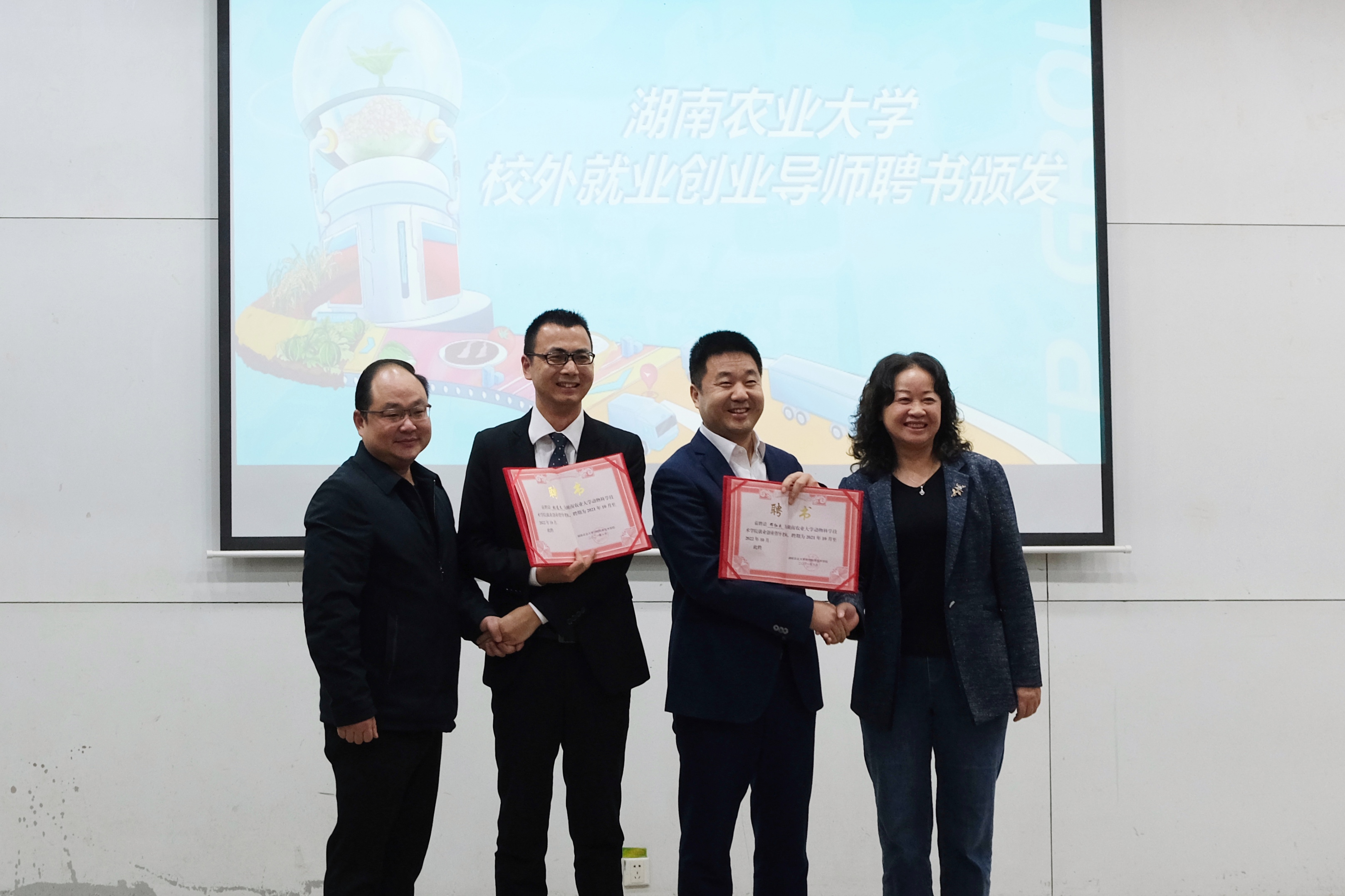 在校企合作协议签订过程中,动科学院王奎武书记与正大集团张道文总监代表双方单位进行签约,全场掌声雷动。随后,张立副校长、张胜利主任分别为邓红成总裁、张道文总监颁发校外就业创业导师聘书。校企合作不仅为正大集团培养输送了优质人才,提供了精英队伍,还为湘农学子创造了广阔的实习基地,为我校掌握学科前沿、面向市场需求进行精准科研创造了有利条件。