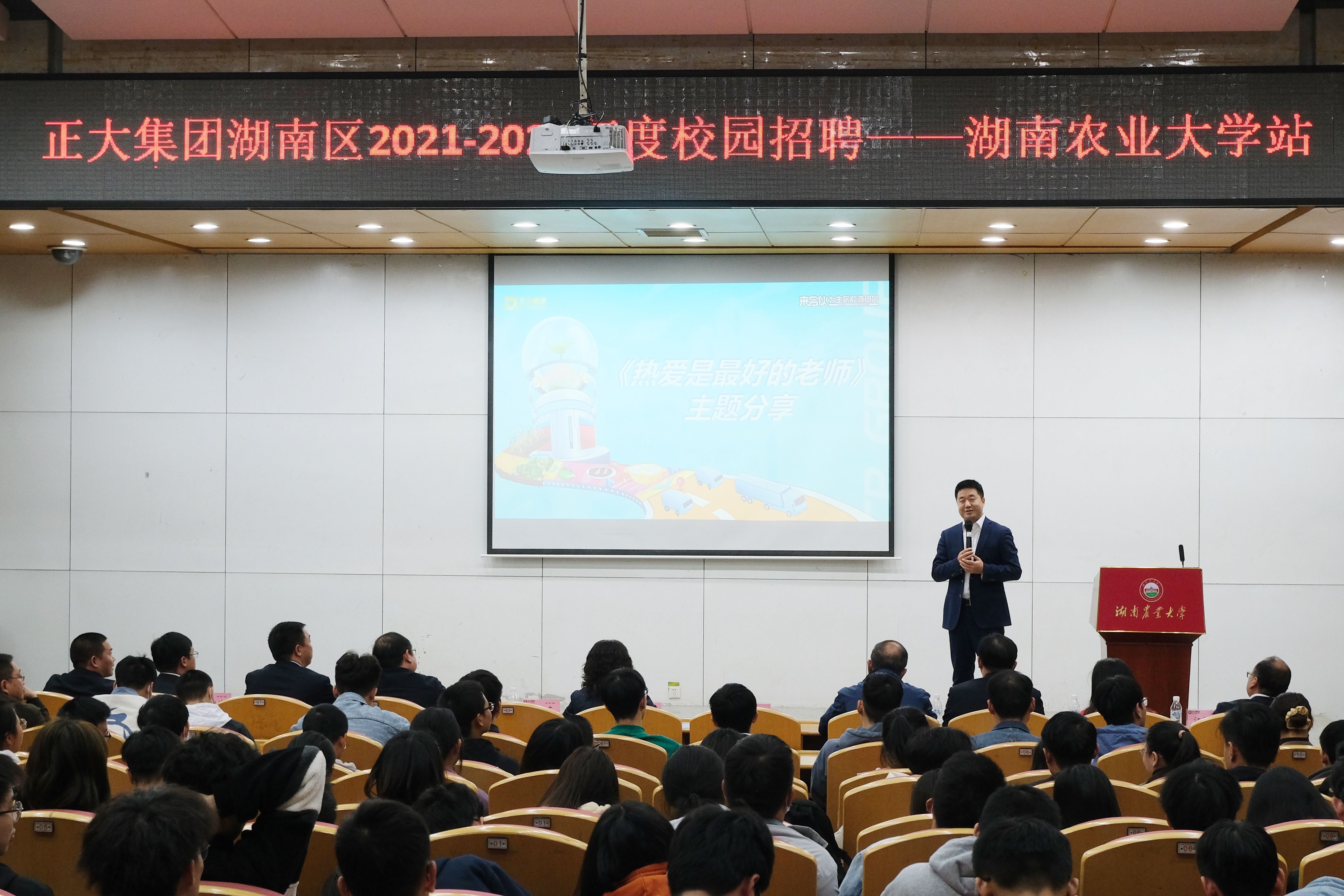 正大集团湖南地区资深总裁邓红成带来的《热爱是最好的老师》主题分享,结合自身经历,为大家从多方面介绍了正大集团企业价值观和政治诚信观,鼓励湘农学子热爱自身行业,热爱所在企业,投身正大,成就自己,奉献社会。