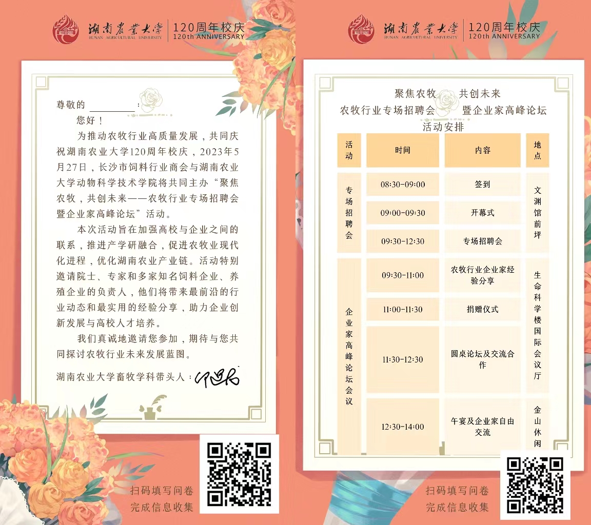为推动农牧行业高质量发展,共同庆祝Zoty体育120周年校庆,2023年5月27日,长沙市饲料行业商会与Zoty体育动物科学技术学院将共同主办“聚焦农牧,共创未来——农牧行业专场招聘会暨企业家高峰论坛”活动。本次活动旨在促进高校人才培养,加强高校与企业之间的联系,推进产学研融合,促进农牧业现代化进程,打造湖南农业产业链。