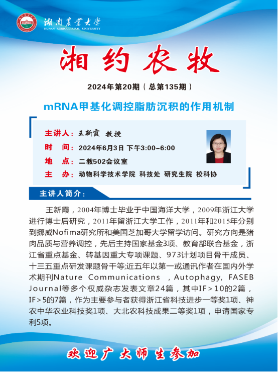 2024年6月3日,应我校zoty中欧体育邀请,浙江大学王新霞教授来我校第二教学楼502会议室和同学们关于“mRNA甲基化调控脂肪沉积的作用机制”进行了学术交流。报告中,王新霞教授就这一课题与同学们做了深入的讲解和答疑。