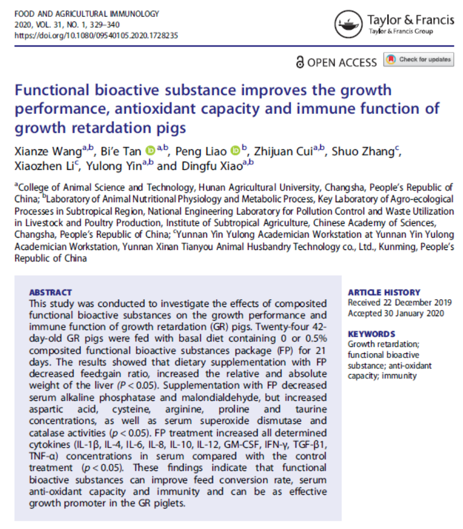 (Functional bioactive substance improves the growth performance, antioxidant capacity and immune function of growth retardation pigs,Food and Agriculture Immunology, 2020, 31(1):329-340. https://doi.org/10.1080/09540105.2020.1728235)