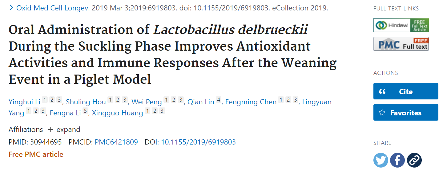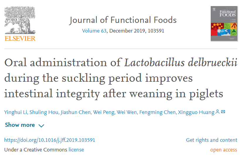 因此,该课题组在仔猪哺乳期进行德氏乳杆菌干预,断奶后继续进行饲养试验,考察了德氏乳杆菌对哺乳仔猪肠道健康的改善作用,更重要的是,探究了早期灌服德氏乳杆菌对断奶后仔猪肠道氧化应激的干预效果及其缓解仔猪肠道屏障氧化损伤作用的机制。研究发现哺乳期灌服徳氏乳杆菌后,有效缓解了哺乳仔猪机体应激状况,刺激了机体的免疫机能,提高了机体的抗氧化能力,改善了小肠绒毛的发育及肠道屏障功能。值得关注的是,这些有益作用大部分持续到断奶后四周仍然存在,从而改善了断奶仔猪后续生长状况并有效降低了试验全期腹泻的发生概率。上述研究结果先后发表在Oxidative Medicine and Cellular Longevity和Journal of Functional Foods杂志上。