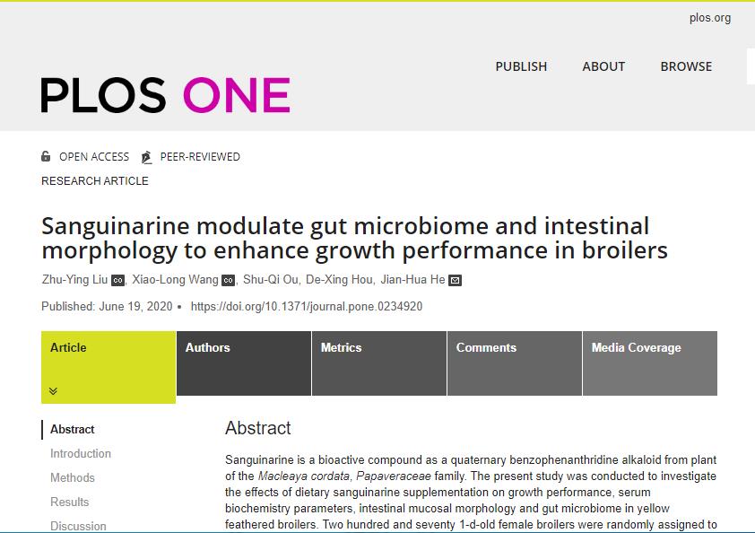 牛膝多糖(achyranthes bidentata polysaccharides, ABP)是从牛膝根中提取的一种多糖,诸多研究表明牛膝多糖具有抗肿瘤、免疫调节、降血糖和抗衰老等多种生物学功能。血根碱(Sanguinarine,SA)是主要从博落回中提取的生物碱,具有抗菌、抗炎、抗肿瘤、增强免疫力及杀虫等作用。我院贺建华教授课题组前期研究结果表明牛膝多糖和血根碱作为植物提取物,在黄羽肉鸡的应用上表现出了促生长、防腹泻、提高免疫力和抗炎的效果。