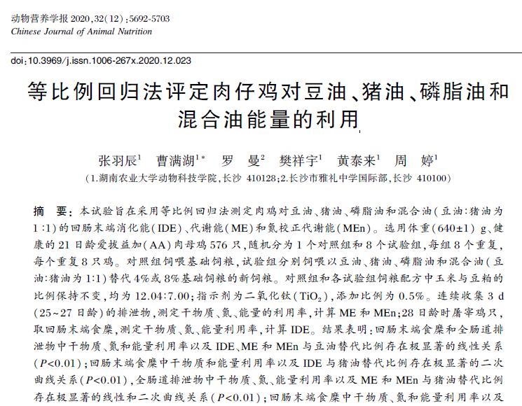(Energy value of rice, broken rice and rice bran for broiler chickens by the regression method, Poultry Science, DOI: .org/10.1016/j.psj.2020.12.069;等比例回归法评定肉仔鸡对豆油、猪油、磷脂油和混合油能量的利用, 动物营养学报(2020,32(12):5692-5703)。