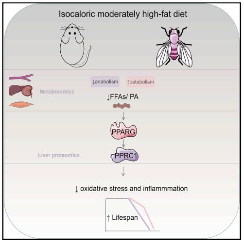 高脂饮食对健康的影响一直是公共卫生领域最令人烦恼的问题之一。其实脂肪的负面影响主要来源于过量的能量摄入,那么如果能控制总能量,多摄入脂肪会有什么不良影响吗?之前,有两项研究都是在控制总能量的情况下,分别采用60%和90%由脂肪提供能量的饮食作为试验组,证明了高脂饮食对健康的潜在益处,但试验持续时间相对较短,或者是脂肪比例极高,无法说明更加适度比例的高脂饮食对健康的长期影响。哈尔滨医科大学公共卫生学院孙长颢教授团队经过深入研究,发现在摄入总能量相等的条件下,相比正常饮食,适度高脂饮食有助于改善炎症和氧化应激,并且可以延长寿命。1.他们将90只大鼠分为3组,按照正常的随意饮食(对照组)、等热量适度高脂饮食(IHF,35%热量来自脂肪)和高脂随意饮食(FHF)喂养2年,发现IHF组大鼠有更长的寿命和健康寿命;另外在对衰老有关的一系列生物标志物进行检测后,发现IHF可以减少炎症和氧化应激。2.对参与脂肪代谢的几种酶进行测定后,发现IHF通过减少游离脂肪酸(FFA)合成代谢和增加其分解代谢来降低血清和多个组织中的FFA分布,并且只有棕榈酸(PA)在血液和各个组织中都减少。游离脂肪酸对炎症和氧化应激都有促进作用,因此,减少总的和特定类型的游离脂肪酸可能是IHF减少炎症和氧化应激的关键。3.对大鼠肝脏进行蛋白组学分析后,进一步验证了上述结果,同时发现IHF显著上调过氧化物酶体增殖激活受体-γ辅激活因子1(PPRC1)蛋白,并且PPRC1的表达与PA水平呈强负相关性。4.在果蝇中,研究人员也观察到了IHF同样的作用。5.通过构建PPRC1转基因果蝇(RNAi和overexpression)及进行体外试验(HepG2 cells),发现IHF可以显着降低PA,然后在PPARG的介导下,上调PPRC1水平,从而改善氧化应激和炎症反应并延长寿命。6.最后,评估了人类肝脏PPARG/PPRC1与年龄的关系,发现PPARG和PPRC1的表达水平与肝组织中ROS、total FFAs、PA以及年龄均呈负相关关系,这为人类衰老和氧化应激相关疾病寻找了潜在治疗靶点。以上研究发表在Cell Metabolism杂志。全文链接:https://doi.org/10.1016/j.cmet.2020.12.017
